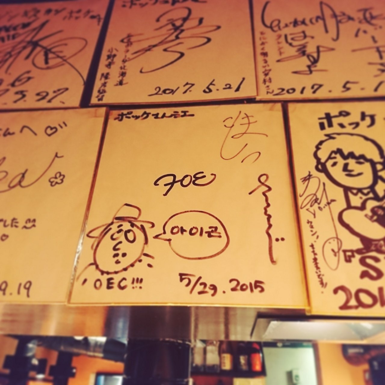 お腹いっぱい食べて、「ふーっ」っと上をみたら、サインがたくさん飾ってあった。