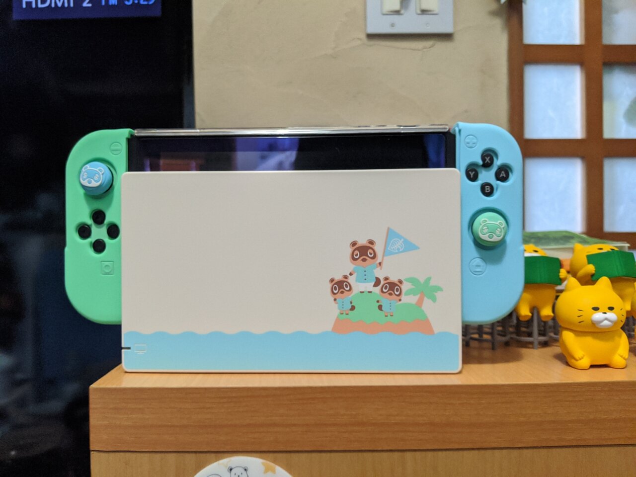 あつ森版のSwitchは、本体裏側にどうぶつたちのシルエットが浮き彫りみたいになってるのもかわいいし、ドックのたぬきちたちもかわいいし、色もかわいい。